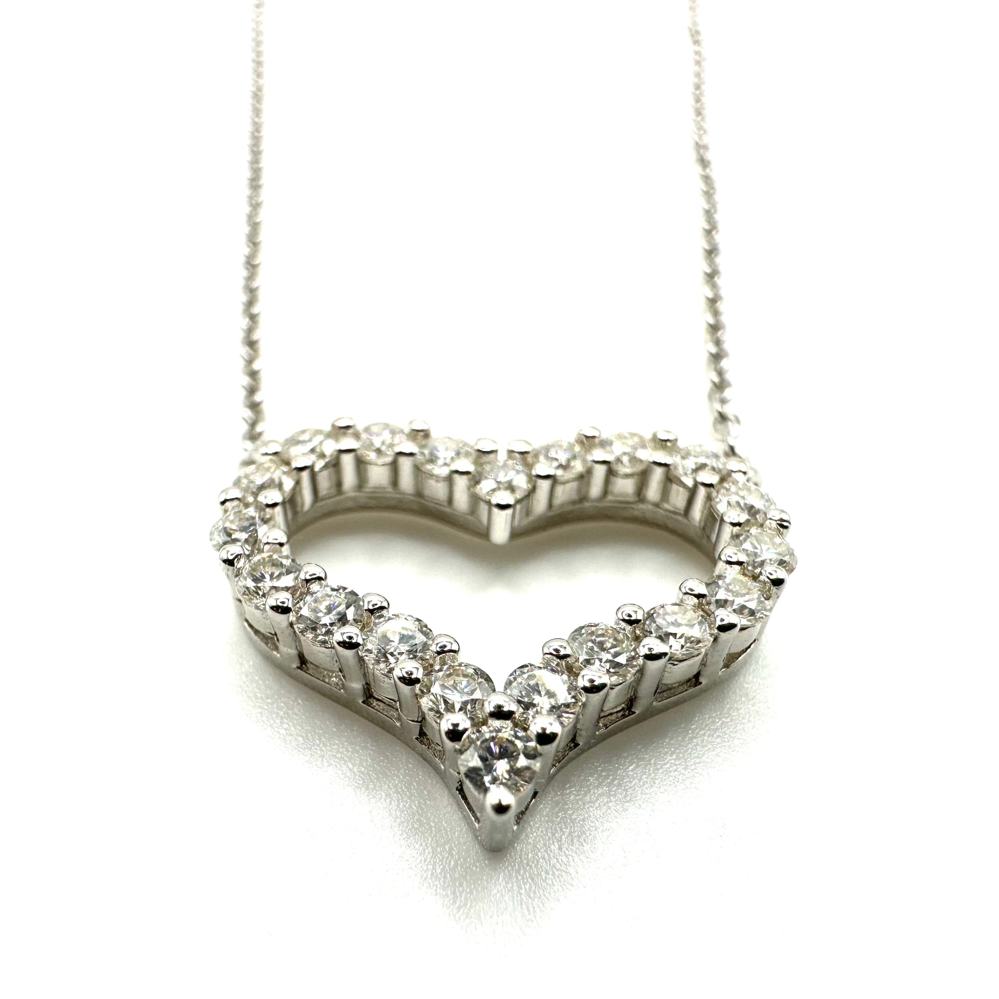 An exquisite symbol of love, this dazzling pendant is designed in a classic heart shape. The open heart frame is adorned with 20 shimmering 0.03ct Moissanite stones in a prong setting. This stunning Moissanite heart pendant is finely crafted in 18K White-Gold plated 925 Silver.
