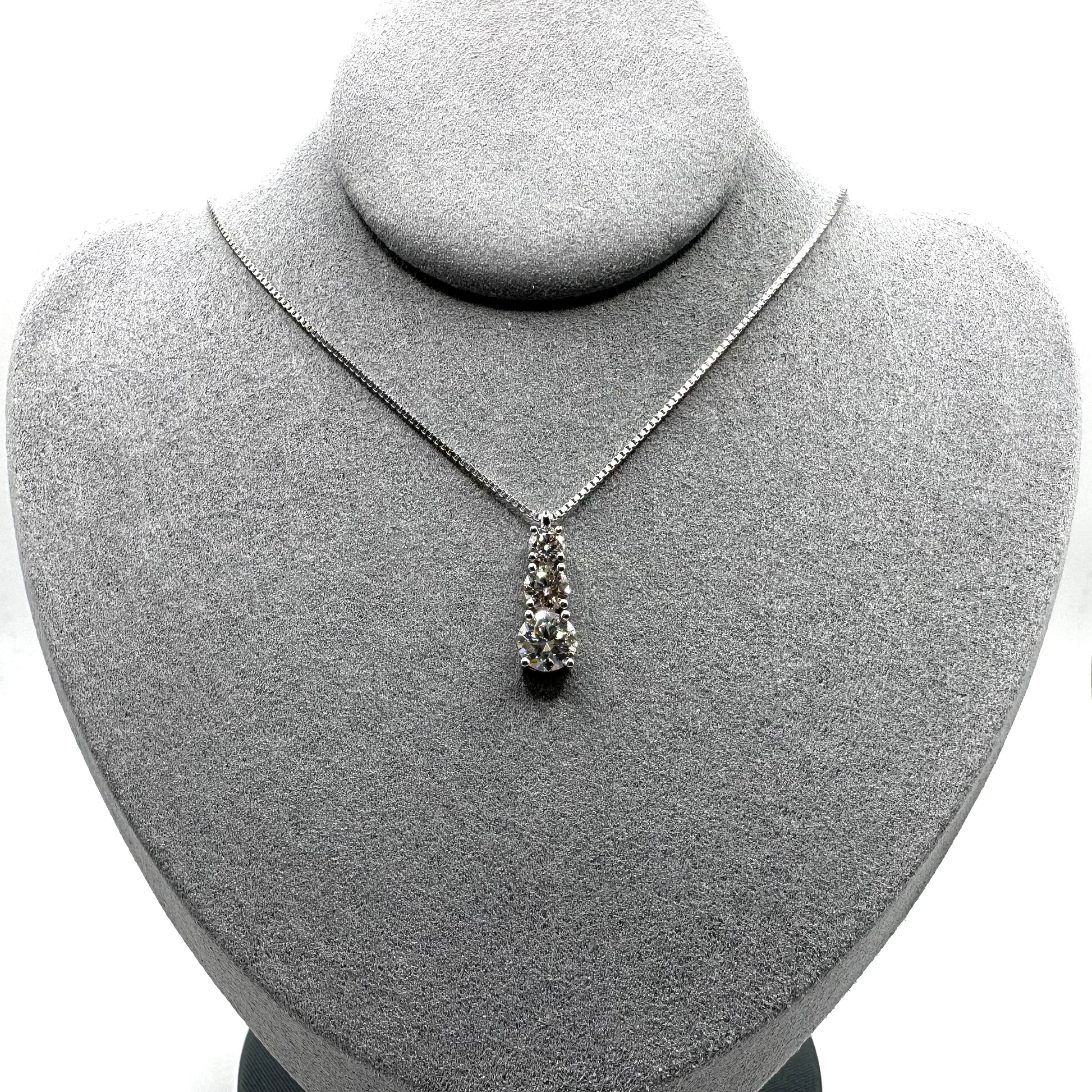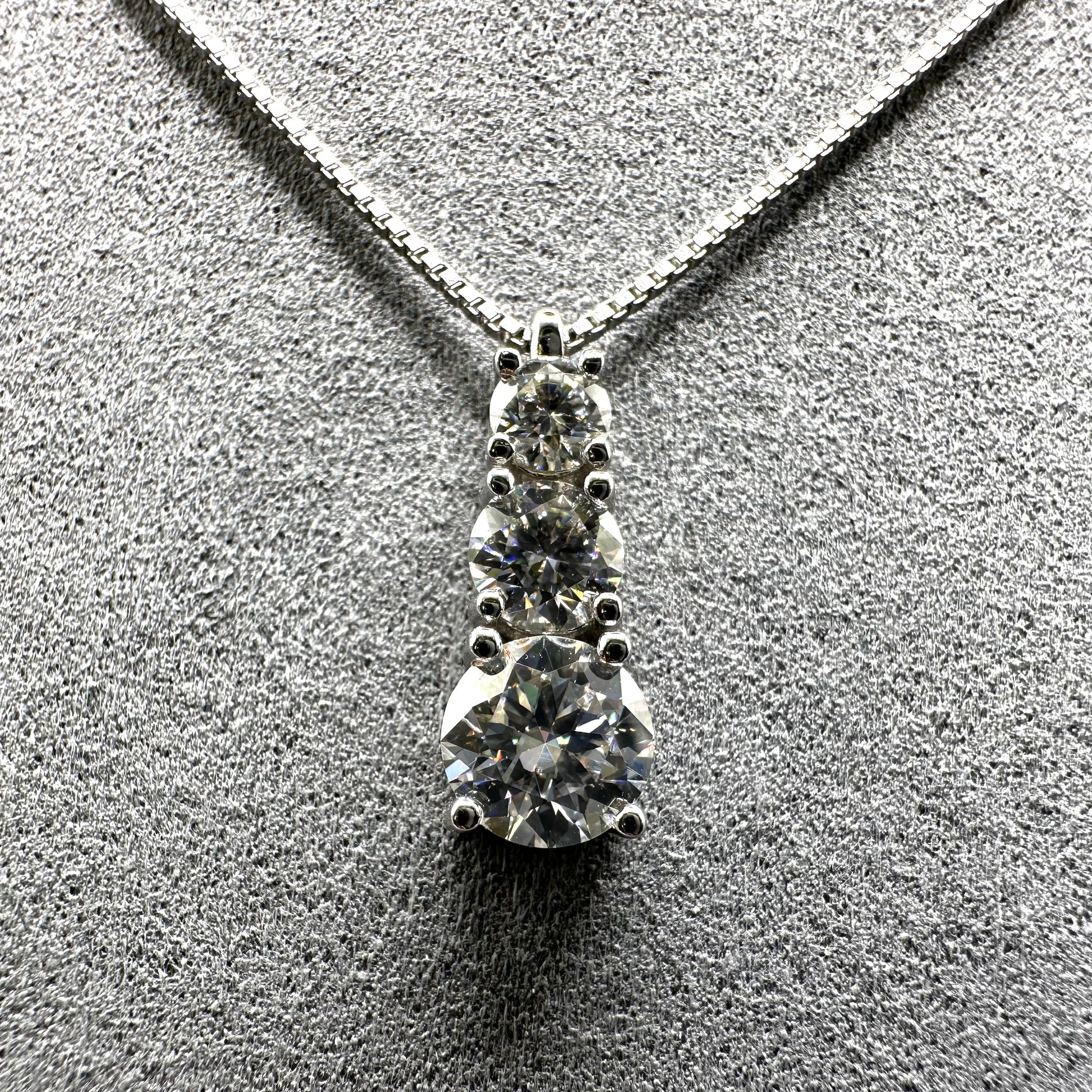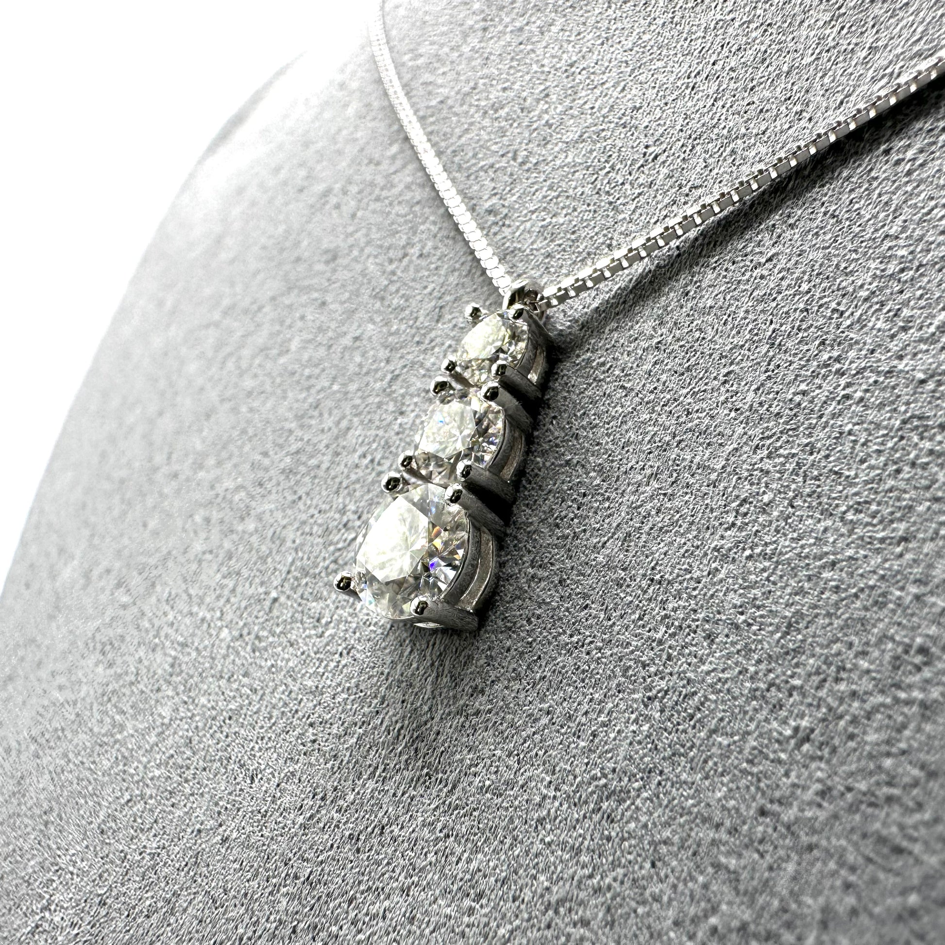 A beautiful graduated pendant featuring three round cut Moissanites with GRA certificates for each stone.