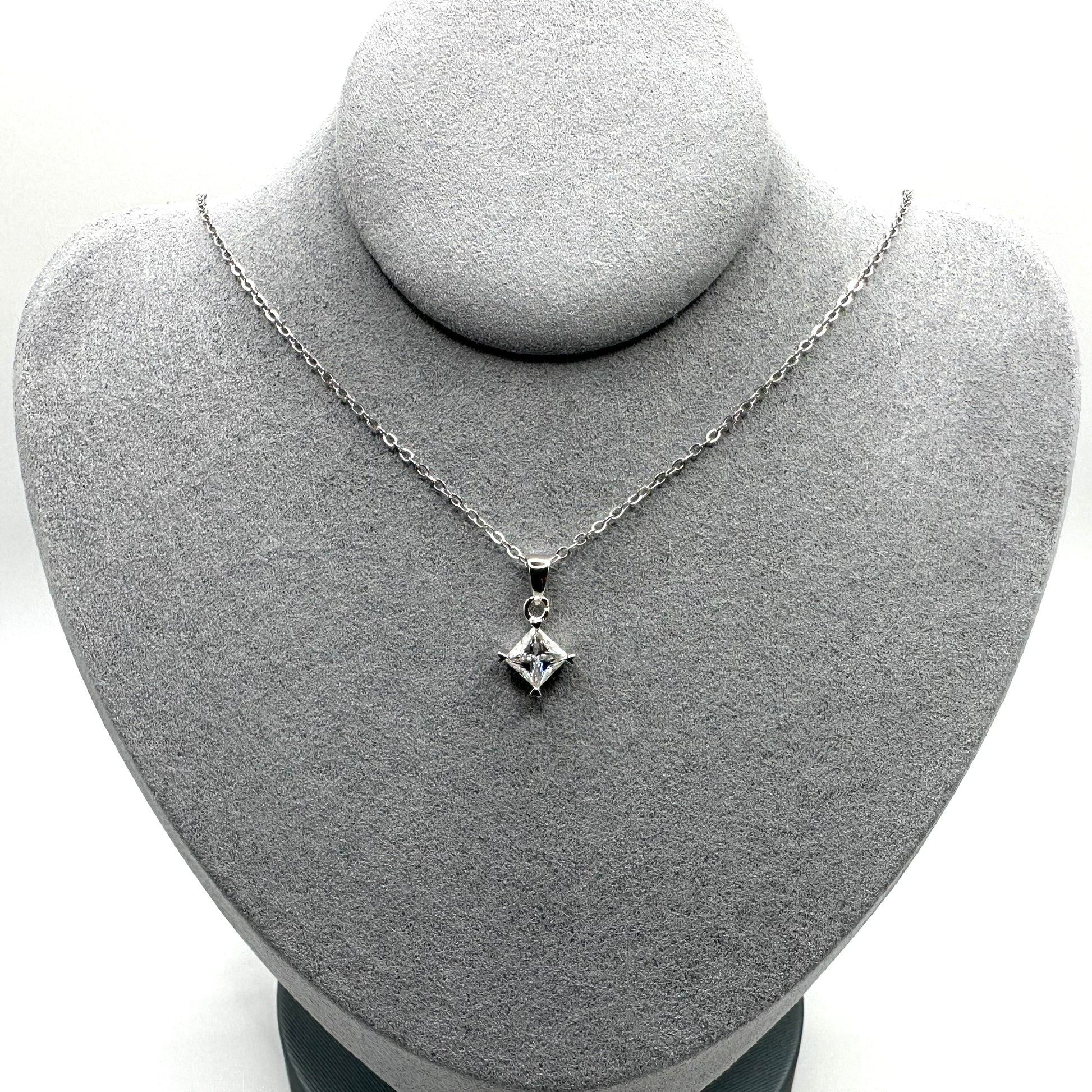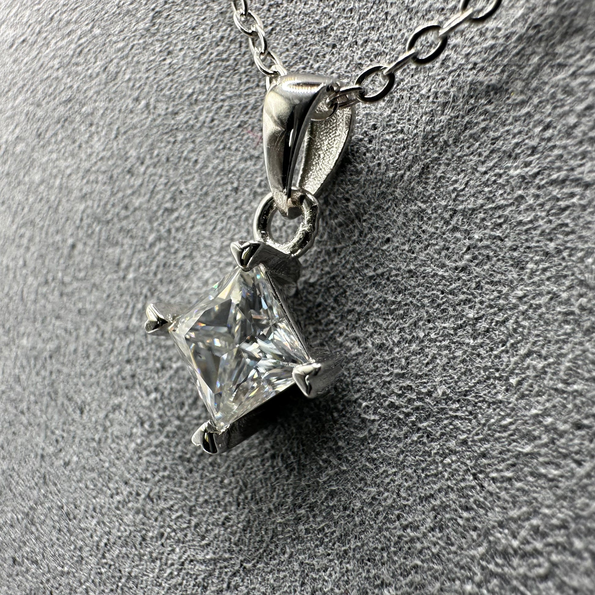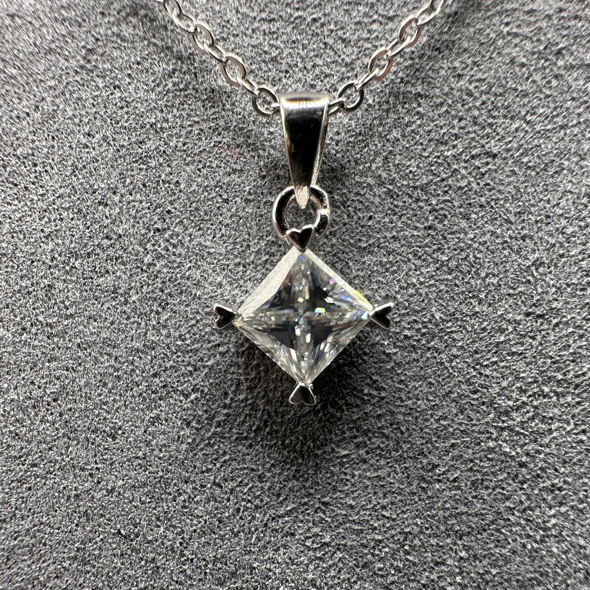 Radiating fire and brilliance, the princess cut is a popular contemporary alternative to the classic round cut. This stunning pendant is features a 1ct princess cut Moissanite accommodated in a four-prong setting.