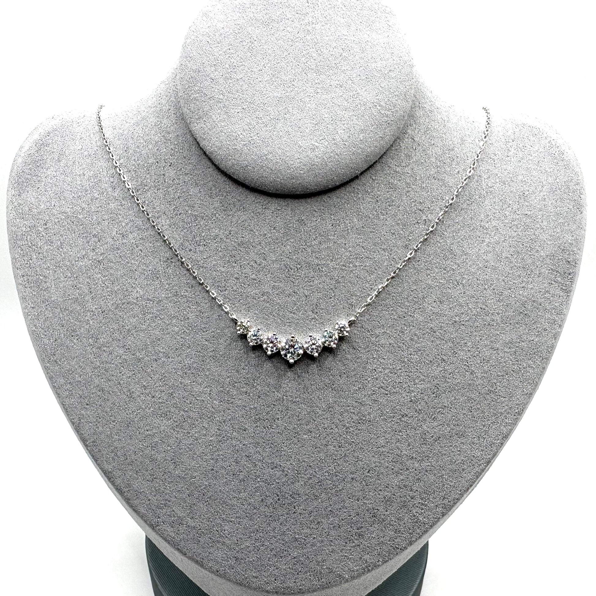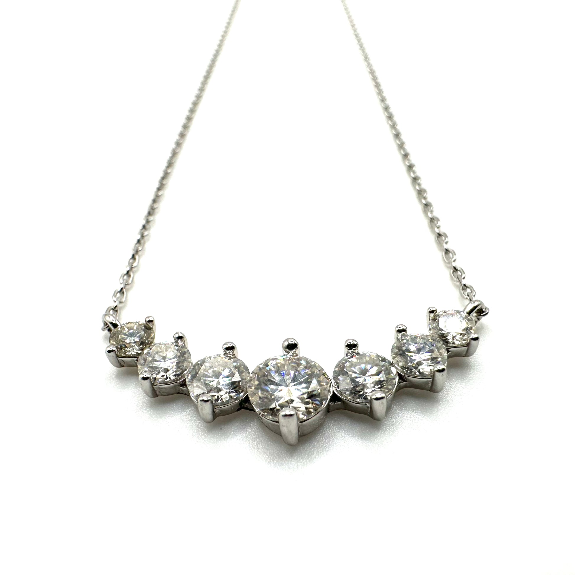 A delicate pendant with graduating Moissanites to perfectly complement your neckline. Featuring seven brilliant round cut Moissanites with a 0.5ct bottom stone.