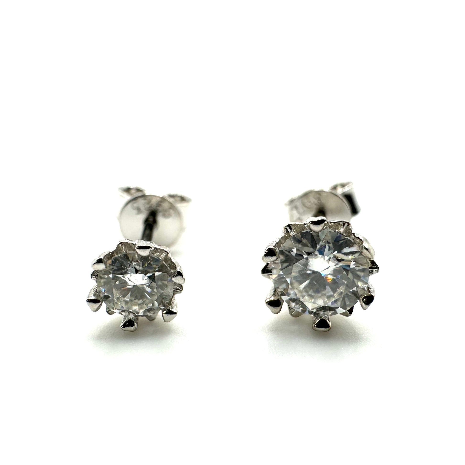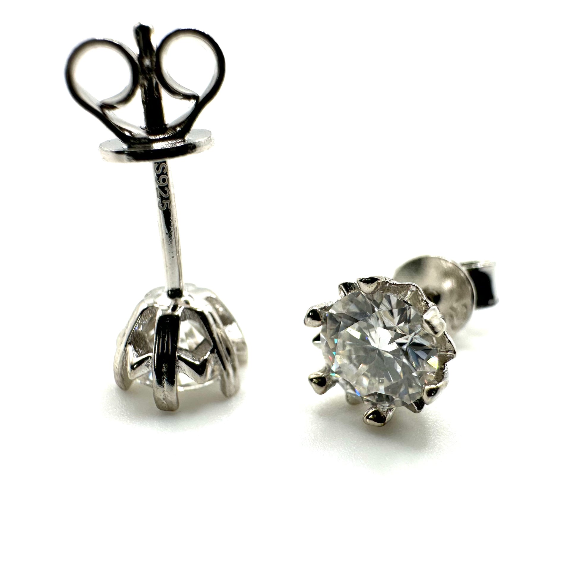 An alluring choice of stud earrings in a snowflake shape with matching brilliant round cut Moissanite centre stones.
